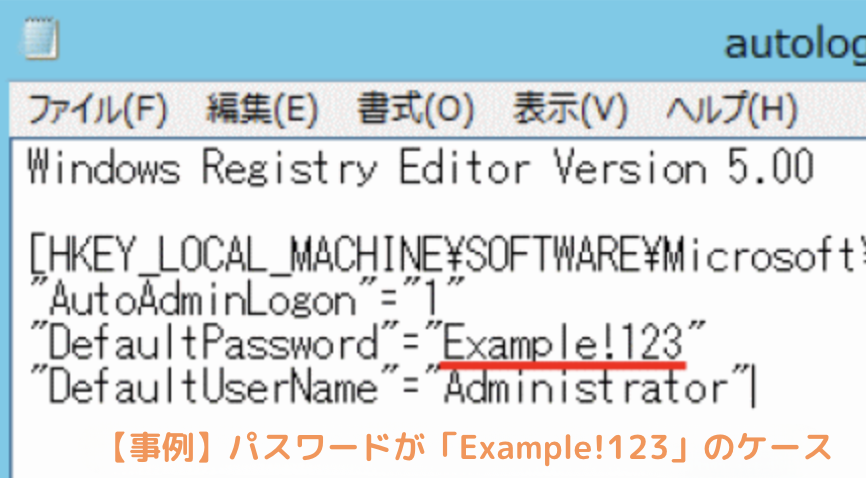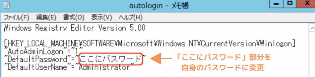 ここにパスワード”の部分をご自身の Windows Server ログインパスワード に書き換え※パスワードは半角英数字で入力し、大文字と小文字を正確に区別してください