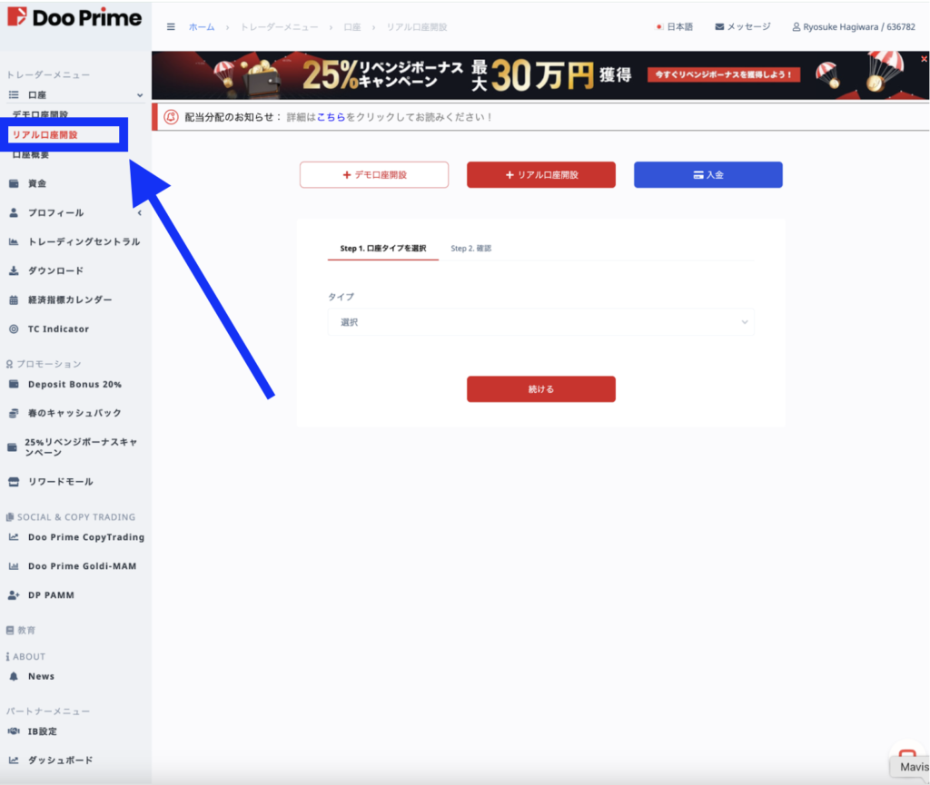 画面左側、トレーダーメニューの「リアル口座開設」というところから、申請をいただければ追加で口座開設が可能です。(流れは初回開設と同様)